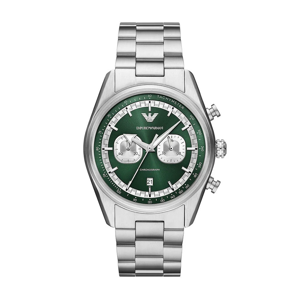 L’Emporio Armani AR11637 appartient à la collection Racer. Elle se distingue immédiatement par son cadran vert dégradé « soleillé » et ses sous-cadrans argentés contrastés, un design classique souvent appelé cadran « Panda inversé » dans le monde de l’horlogerie. C’est une montre qui allie dynamisme sportif et élégance citadine, fidèle à l’ADN de la maison Armani.